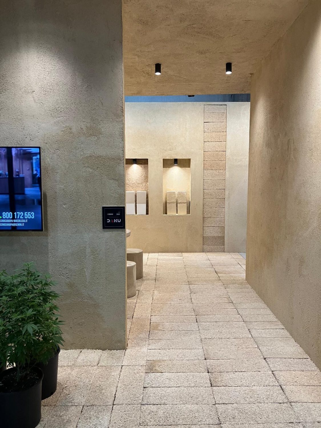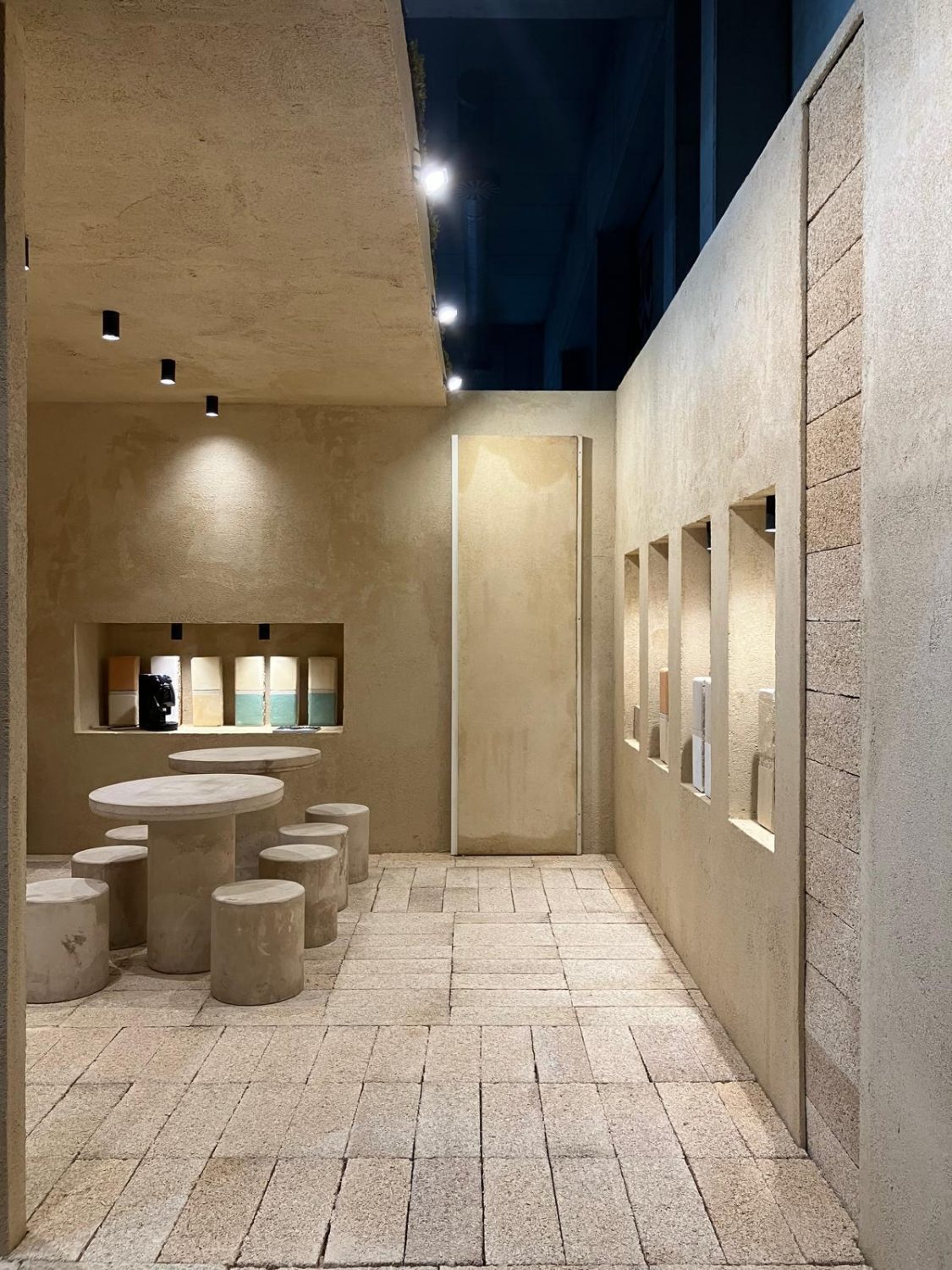 I mattoni, messi in evidenza da scorci ricavati all’interno delle pareti. E poi l’intonaco che, come afferma Marco Carini, l’architetto che ha progettato lo stand “è vibrante e scabro come la vita. Irregolare, perfetto così com’è.