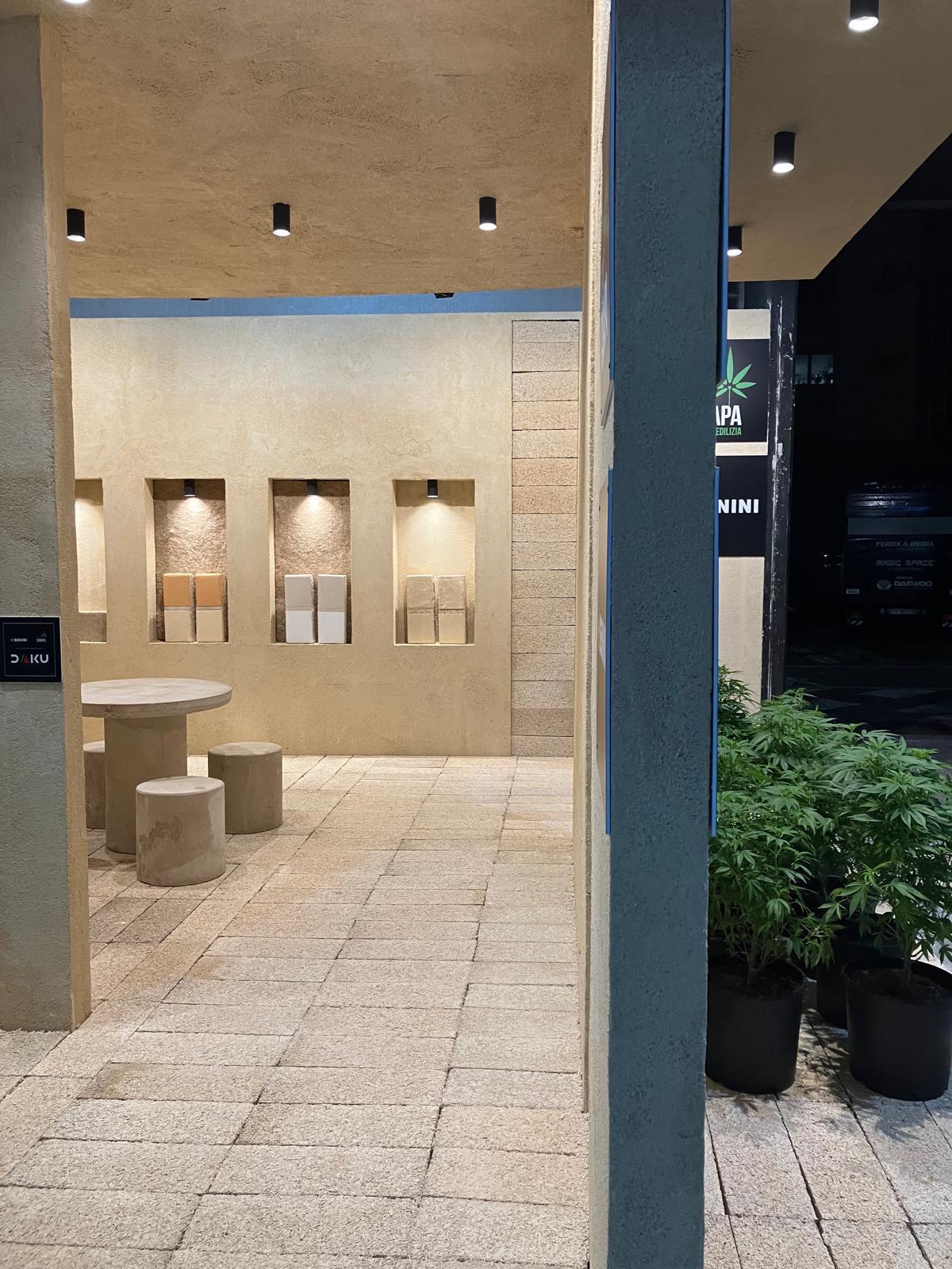 Dunque un’installazione Inoltre, tagli di luce, nicchie, per dare profondità, per rendere più intrigante il percorso, per scoprire, da diverse angolazioni, uno stand ricco, ampio, completo. Campioni di mattoni con intonaco a gran fine e più grezza, fibra di canapa e canapulo, legante a base canapa, si mostrano, discreti in seconda battuta.