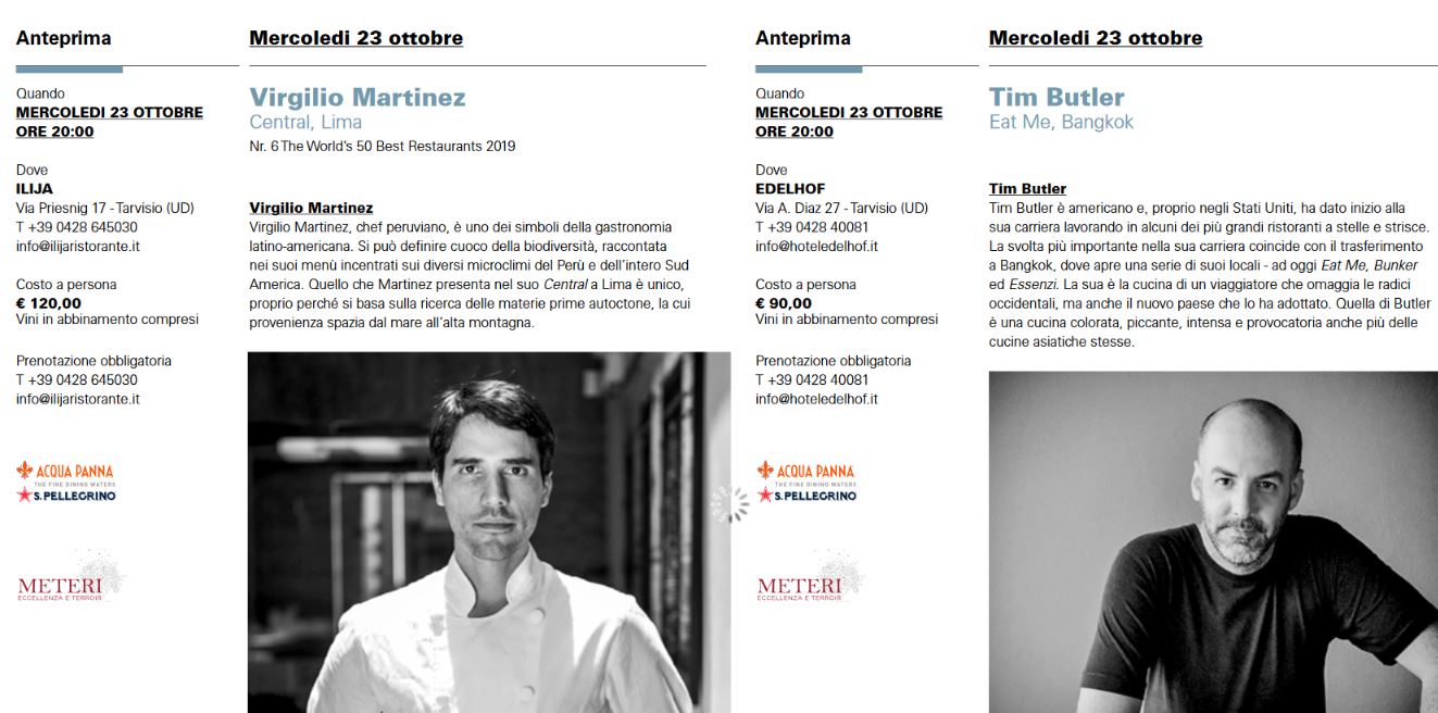 GLI CHEF A TARVISIO – Nella giornata del 23 ottobre a Tarvisio, gli chef Virgilio Martinez, Tim Butler, Giancarlo Toso saranno nei ristoranti cittadini a portare le loro pietanze. A Udine il 24 i due moscoviti Vladimir Mukhin e Anatoly Kazakov saranno tra le star della ristorazione temporanea. Con loro, Antonia Klugmann, Maksut Askar, gli stellati italiani Cristoforo Trapani (Forte dei Marmi), Giuseppe Iannotti (Telese Terme), Cristian Torsiello (Paestum), Errico Recanati (Loreto).