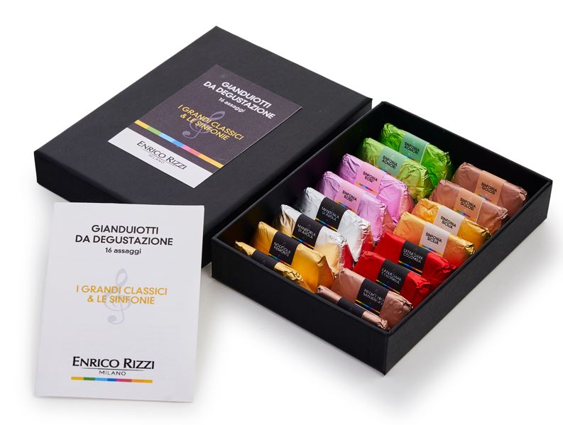 Gianduiotti: 4 in versione classica e 4 dedicati alle Sinfonie (https://enricorizzi.com/collections/guanduiotti/products/cofanetto-16-gianduiotti-i-grandi-classici-e-le-sinfonie)