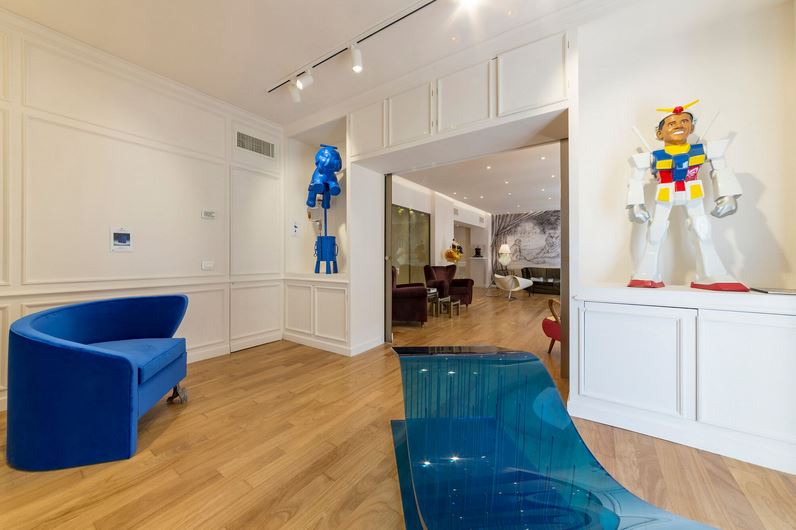 In un contesto affascinante realizzato dall’Interior Designer Susanna Fazioni e con la Direzione Artistica di Giovanna Repossi, pezzi di modernariato di Roberta e Basta, opere d’autore di Manuela Carrano (arte su muro e quadri), Francesco De Molfetta (oggetti d’arte), Luca Sacchetti (Kiss chaise longue), Damiano Spelta (Xolez Matte Black) e Verteramo (Efesto Armoire, Lady Grace Armchair, Jewel Painting), Matteo Bracciali (elefantino blu), Miro Persolja (due opere Fiore e Rosa), Gianni Arosio (opere in legno).