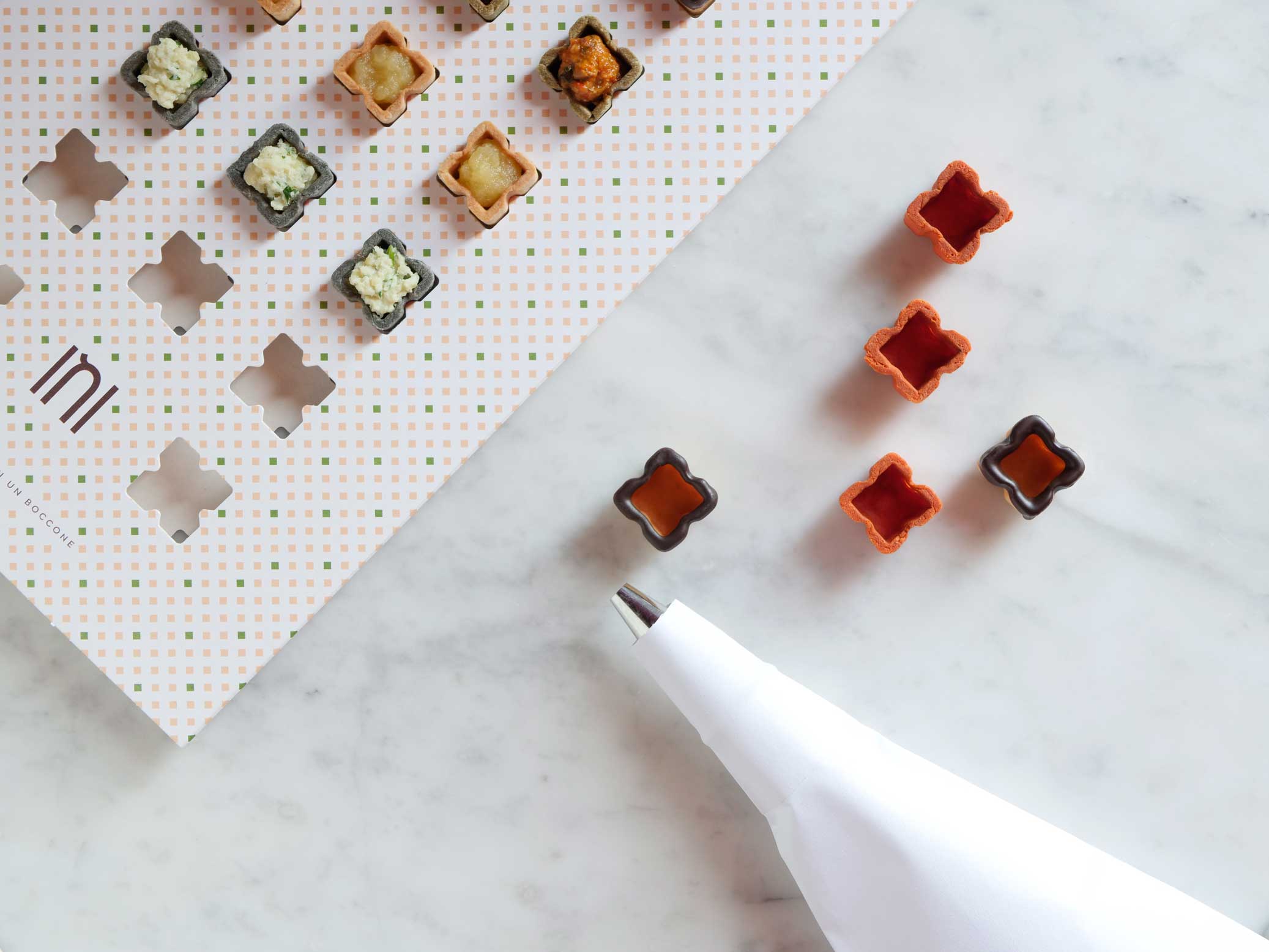 Denominato anche il “boccone perfetto” per gustare sapori e consistenze di un piatto gourmet, si presenta come una tartelletta di 2,5 cm di lato che custodisce una crema fatta con ingredienti freschi ed eccellenze agroalimentari italiane.
