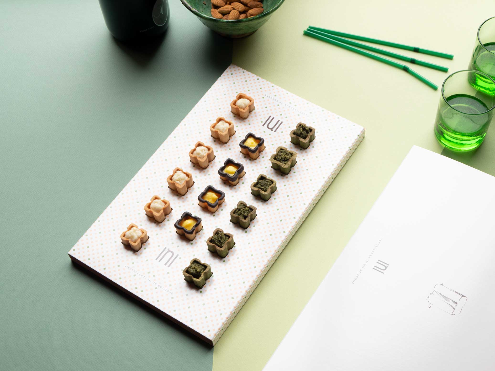 Frutto di tre anni di lavoro e infiniti assaggi, le 30 ricette del menu INI spaziano dalla delicatezza del pesce e delle verdure fresche al gusto deciso delle carni selezionate e dei formaggi italiani: materie prime di alta qualità ed eccellenze dell’agroalimentare italiano. Non meno tempo è stato dedicato alla progettazione della cialda che rende gli INI un esempio da manuale di food design, firmato proprio da chi ha portato questa disciplina in Italia. Paolo Barichella, mente empirica, ha definito dimensione e volumetria delle cialde sulla base dei principi dell’antropometria del cibo; Mauro Olivieri, anima estetica, ha interpretato i numeri in chiave creativa e, ispirandosi all’arte musiva e seguendo le regole dell’ergonometria, ha disegnato la “tessera INI”.