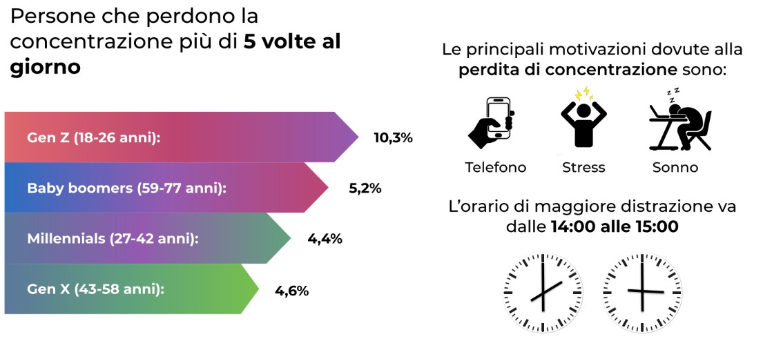 Un recente studio condotto da Juice Plus+, che ha coinvolto oltre 12.000 persone in sei Paesi, ha rivelato che trascorriamo in media più di 5 ore al giorno senza concentrazione. Tra i principali fattori di distrazione emergono l’uso eccessivo dello smartphone, lo stress e la mancanza di sonno, che influiscono pesantemente sulla produttività quotidiana. Il 6,1% degli intervistati ha dichiarato di perdere la concentrazione più di cinque volte al giorno, con percentuali più elevate tra le generazioni più giovani. In particolare, il 10,3% della Gen Z (18-26 anni) e il 4,6% dei Millennials (27-42 anni) riportano difficoltà significative nel mantenere il focus durante la giornata. Anche le generazioni più adulte non sono immuni a questo fenomeno: il 4,4% della Gen X (43-58 anni) e il 5,2% dei Baby Boomers (59-77 anni) hanno segnalato problemi simili. Inoltre, il picco di distrazione si verifica tra le 14:00 e le 15:00, momento della giornata in cui la capacità di focalizzarsi sulle attività più importanti subisce il calo maggiore. Questi dati sottolineano quanto sia diffusa la difficoltà di mantenere la concentrazione e quanto sia fondamentale trovare soluzioni efficaci per migliorare il benessere mentale e la produttività quotidiana.