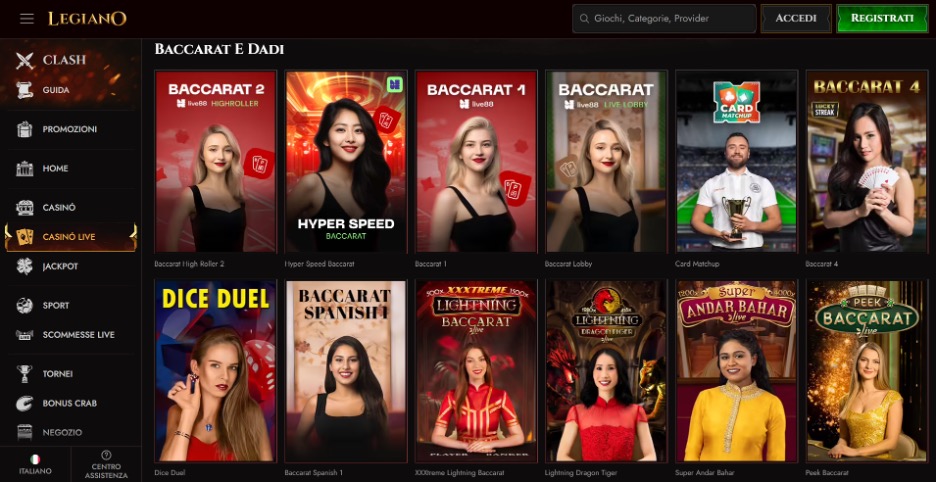 Legiano è una piattaforma moderna e completa, ideale per gli amanti del Baccarat. Offre varianti classiche come il Punto Banco e versioni live con croupier professionisti. Grazie alla grafica avanzata e ai limiti di puntata flessibili, Legiano è perfetto per principianti e giocatori esperti. Le promozioni settimanali e il servizio clienti impeccabile rendono l’esperienza ancora più piacevole.