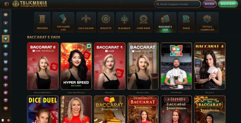 Talismania è un casinò innovativo che mette il Baccarat al centro della sua offerta. Con un’interfaccia user-friendly e una vasta selezione di giochi live, Talismania è perfetto per chi cerca un’esperienza immersiva. Offre bonus di benvenuto generosi e promozioni dedicate, permettendo ai giocatori di massimizzare il divertimento e le vincite.
