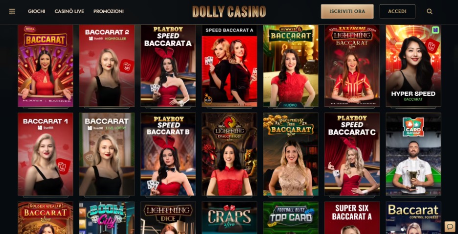 Dolly è un casinò elegante che offre una selezione di giochi di Baccarat curata nei minimi dettagli. La sezione live, con streaming di alta qualità, ti consente di vivere il fascino di un vero casinò da casa. Dolly è rinomato per le sue promozioni esclusive, i limiti di puntata personalizzabili e l’assistenza clienti disponibile 24/7.
