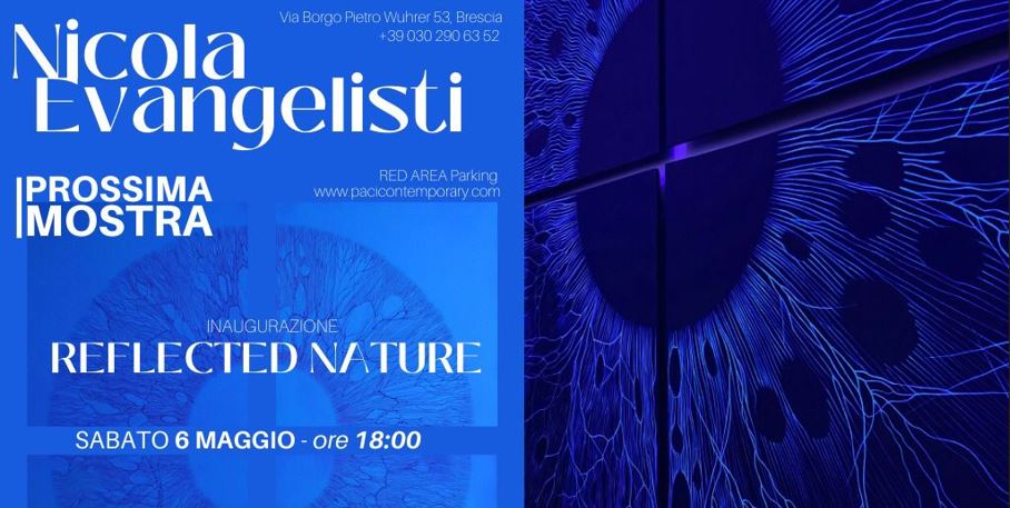 Reflected Nature è una mostra che ripercorre la ricerca sulla luce dell’artista multimediale Nicola Evangelisti: dai suoi storici light box, nuovo concetto di scultura contemporanea, realizzati con materiali tipici della nostra epoca: dall’acciaio al plexiglas, sui quali scorre luminescente e scientificamente costruita la luce artificiale generante molteplici forme caotiche e dinamiche, fino agli ultimi lavori del percorso di black light art, una particolare tecnica di pittura fotosensibile con la quale l’artista dipinge sottili e ramificate forme lineari, definite Strutture Spaziali.