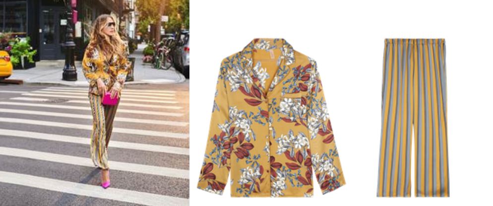 Qui sopra SJP indossa una giacca a manica lunga in raso di viscosa con stampa Fiori Prugna. Il capo è impreziosito da un taschino e profili di raso.