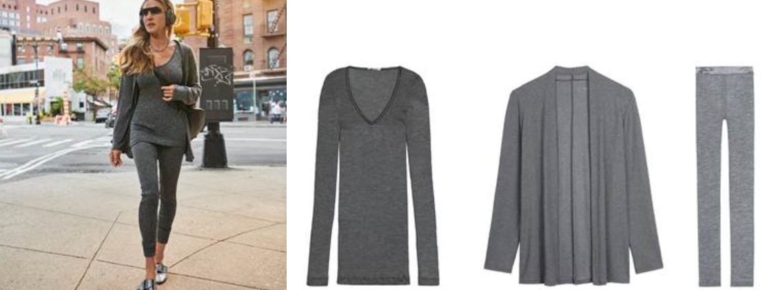 In apertura di servizio vediamo l’attrice con canotta in seta scollata a V, impreziosita da inserti in pizzo sullo scollo e sul fondo. Le spalline sono regolabili. Ideale se indossata come capo intimo o come sottogiacca. Vestaglia manica a kimono in tricot e frange e pantalone lungo in morbida tela di cotone a fantasia tartan con elastico in vita regolabile da coulisse.