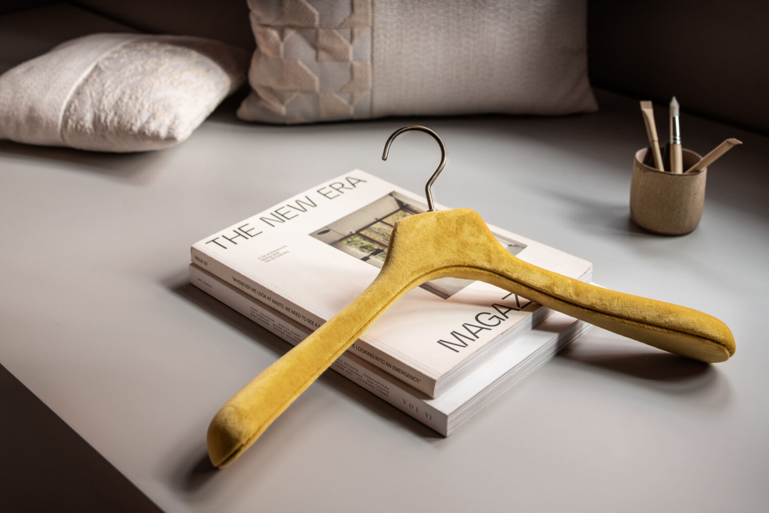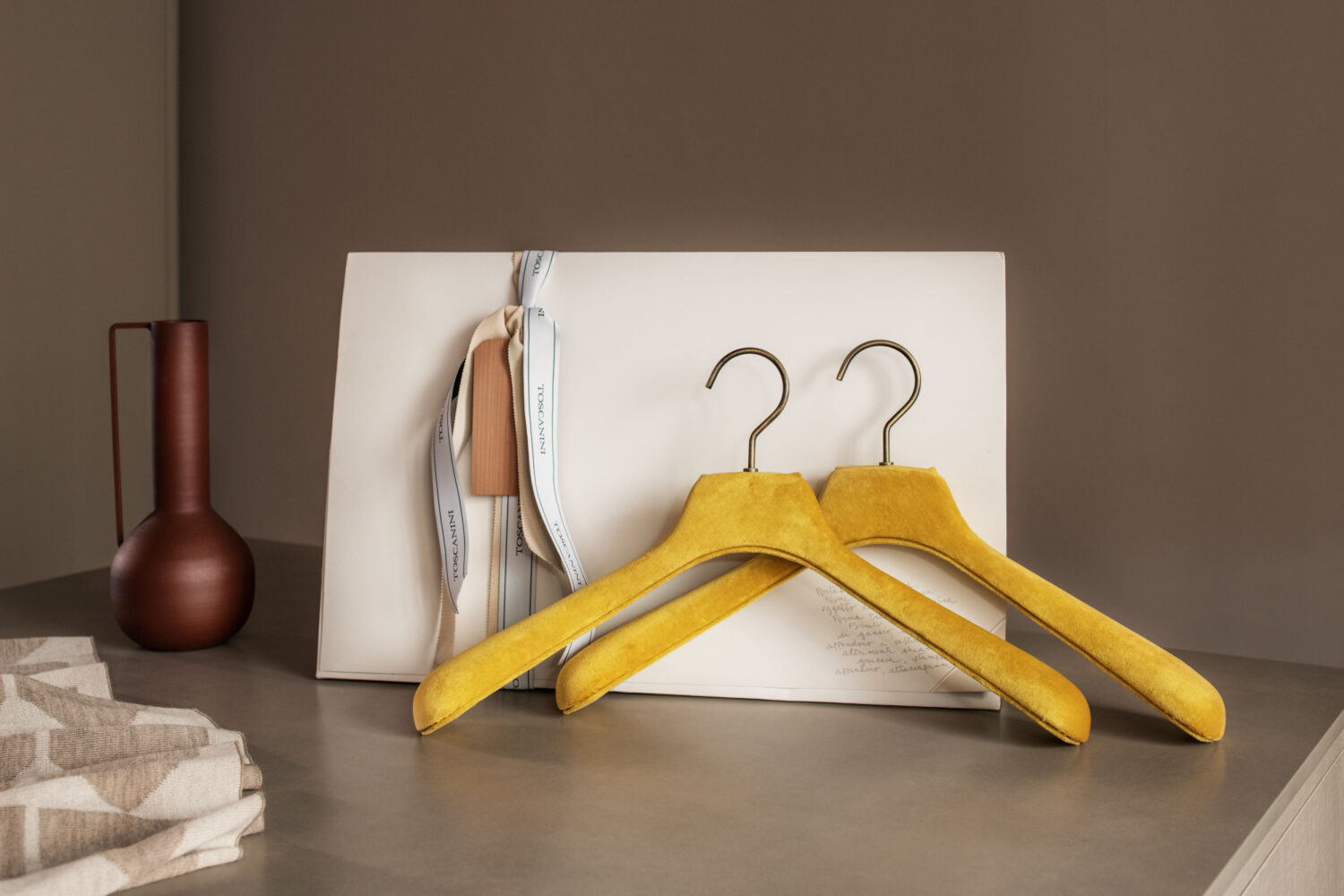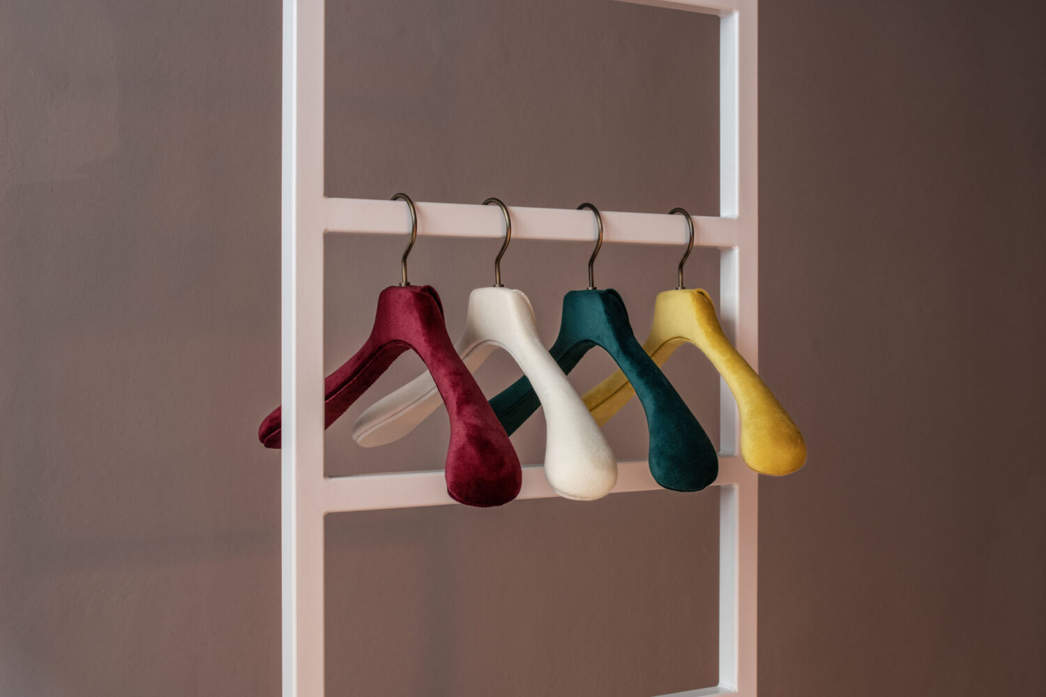 Il velluto è il filo conduttore della collezione. È stato scelto proprio questo tessuto per la sua naturale capacità di evocare un senso di comfort e lusso e per la sua proprietà di catturare la luce in modo delicato creando una sensazione di calore e benessere. Attraverso una selezione accurata di tonalità i portabiti diventano espressione delle stagioni che cambiano. Quattro colori a rappresentare le quattro stagioni: il Grass Green per la primavera, il Mustard Yellow per l’estate, il Winery Marsala per l’autunno e il Comfort White per l’inverno.