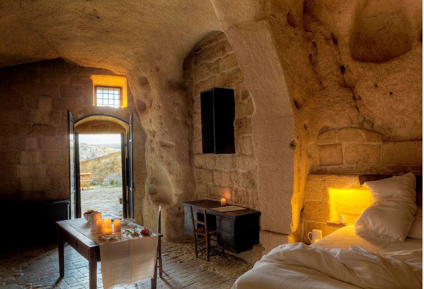Il luogo è Sestantio Le Grotte della Civita nei Sassi di Matera – Sito Patrimonio dell’Umanità UNESCO (a un’ora di distanza dall’aeroporto di Bari) nella Basilicata / Puglia – ed è l’espressione più estrema di un patrimonio storico minore. Un patrimonio, che rappresenta l’espressione quasi paradigmatica di questa Storia Minore, segnata da grotte rocciose, abitate fino ai primi anni Cinquanta. I sassi (insediamento in pietra) sono stati trasformati in 18 romantiche camere da letto boutique, arredate in modo semplice, a lume di candela e rilassante. Sextantio Le Grotte della Civita è un progetto culturale nato per portare esperienze di ospitalità al di fuori degli schemi, non classificabili come “stelle” e lontane da qualsiasi concetto tradizionale di lusso, tanto che il New York Times lo considera una delle “mete più straordinarie” nel mondo “, il Times” uno dei dieci hotel più belli sulla scena internazionale “e la guida Tatler di Condé Nast ha inserito tra” i cento alberghi più belli del pianeta “. Parlano del lusso delle emozioni.