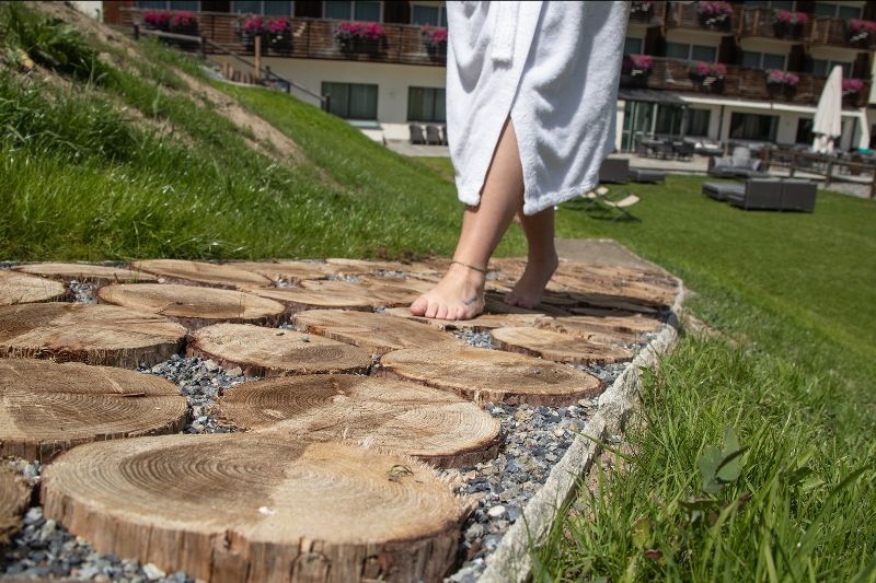 Per chi vuole sentire il calore fluire nel corpo, può scegliere tra la sauna finlandese, l’hammam o la sauna alle erbe; ogni giorno viene utilizzata come essenza una diversa erba medicinale alpina: l’aromaterapia diventa un viaggio virtuale nel bosco montano. Le sale relax ripropongono nella loro architettura i quattro elementi: fuoco, acqua, aria e terra dai quali scaturiscono tutte le forme di vita. Dedicate alla terra sono le due sale relax, arredate con legno locale e materiali naturali. Nella sala relax “Onde di montagna” si viene trasportati via dalla quotidianità grazie alle “onde di benessere” dei lettini riscaldati ad acqua. Nei comodi dondoli sospesi della sala relax “Culla nel bosco” ci si sente avvolti dalla piacevole sensazione del dondolio, una ninna nanna che rimanda alla tranquillità di lasciarsi cullare; solo il musicale cinguettio degli uccelli interrompe il silenzio.