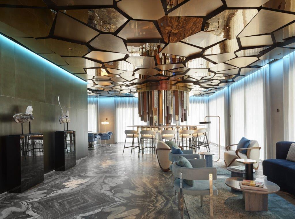 L’edificio ospita cinque suite esclusive arredate con materiali pregiati: ottone, bronzo, rame, legni rari, pelle e tessuti di altissima qualità. Poi c’è la grandissima suite presidenziale all’ultimo piano e al piano attico con terrazza con piscina panoramica e un soggiorno all’aperto con vista a 360 gradi su tutta la Versilia. Un dettaglio esclusivo della suite è il soffitto, che riproduce il plastico dell’intera Versilia con una mappa tridimensionale della costa e dei suoi edifici più iconici, mentre il pavimento è realizzato attraverso una colata di resina trasparente che fissa la sabbia della spiaggia di Forte dei Marmi increspata dal mare e dal vento.