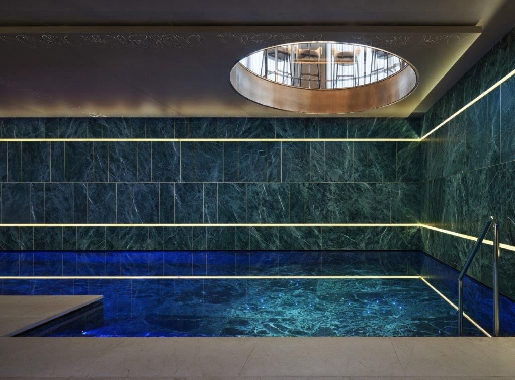 Al piano terra la hall, un ampio spazio soggiorno e la cucina del ristorante (che verrà attivato in un secondo momento); al livello interrato la zona benessere con una piscina rivestita in marmo verde alpi, sauna, bagno turco, sala massaggi e palestra.
