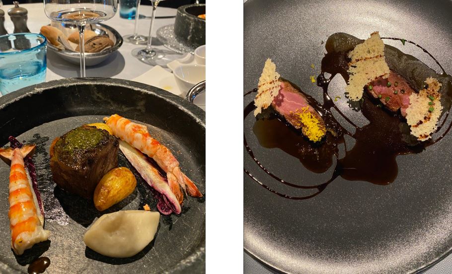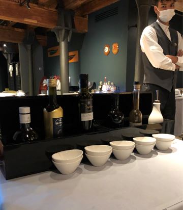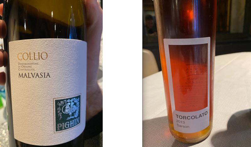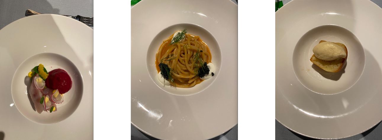La cena preparataci ha spaziato sapientemente tra piatti tradizionali rivisitati e preparazioni internazionali raffinate. Il genius loci è stato rispettato soprattutto dalle basi ittiche, con attenzione peculiare all’utilizzo di verdure del posto. Il tutto è stato condito con ottimi vini della cantina, con largo spazio alle eccellenze venete. Un carrello apposito ha permesso una scelta accurata di olii regionali dal più leggero al più intenso a seconda delle necessità di portata.