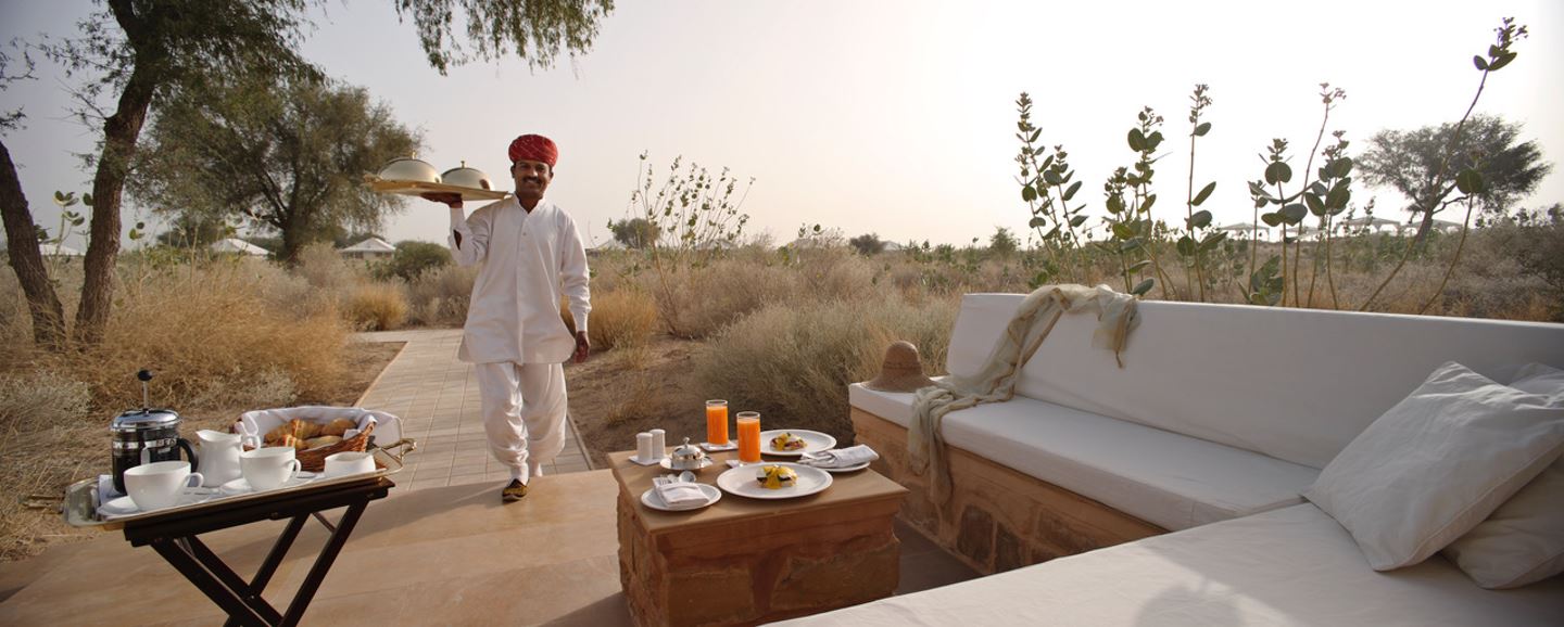 Nei dintorni di Jaisalmer e della sua favolosa fortezza dorata si trova il The Serai, un Camp dallo stile semplice, contemporaneo ed elegante.
