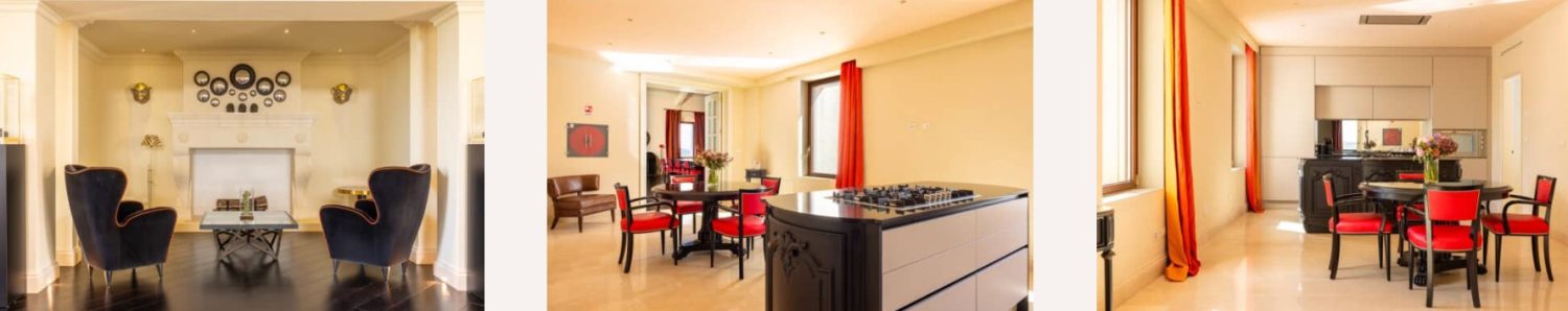 È elegantemente arredato con divani in velluto capitonné, poltrone vintage e sculture di ispirazione classica.