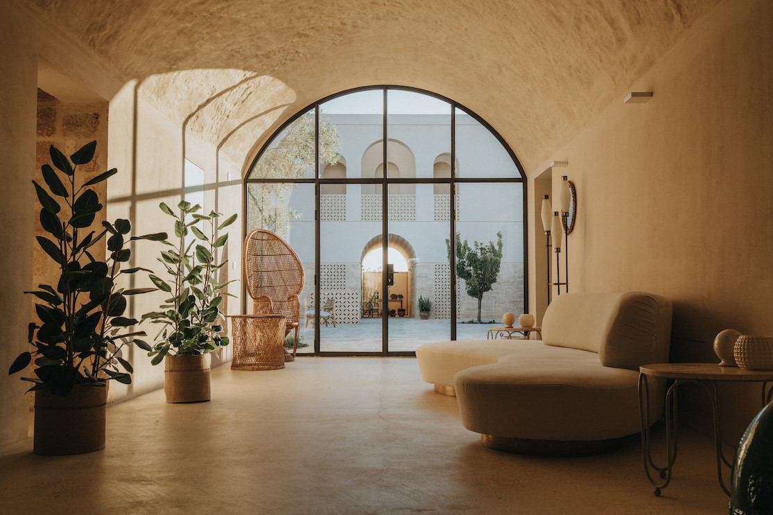 Accogliente e dal design semplice e raffinato la lobby funge da connettivo tra il giardino antistante e la grande corte. Comode poltrone, libri antichi esposti su una credenza mid-century decorata da grafiche floreali e un sinuoso divano bianco offrono agli ospiti della struttura un’occasione di contemplazione e relax.