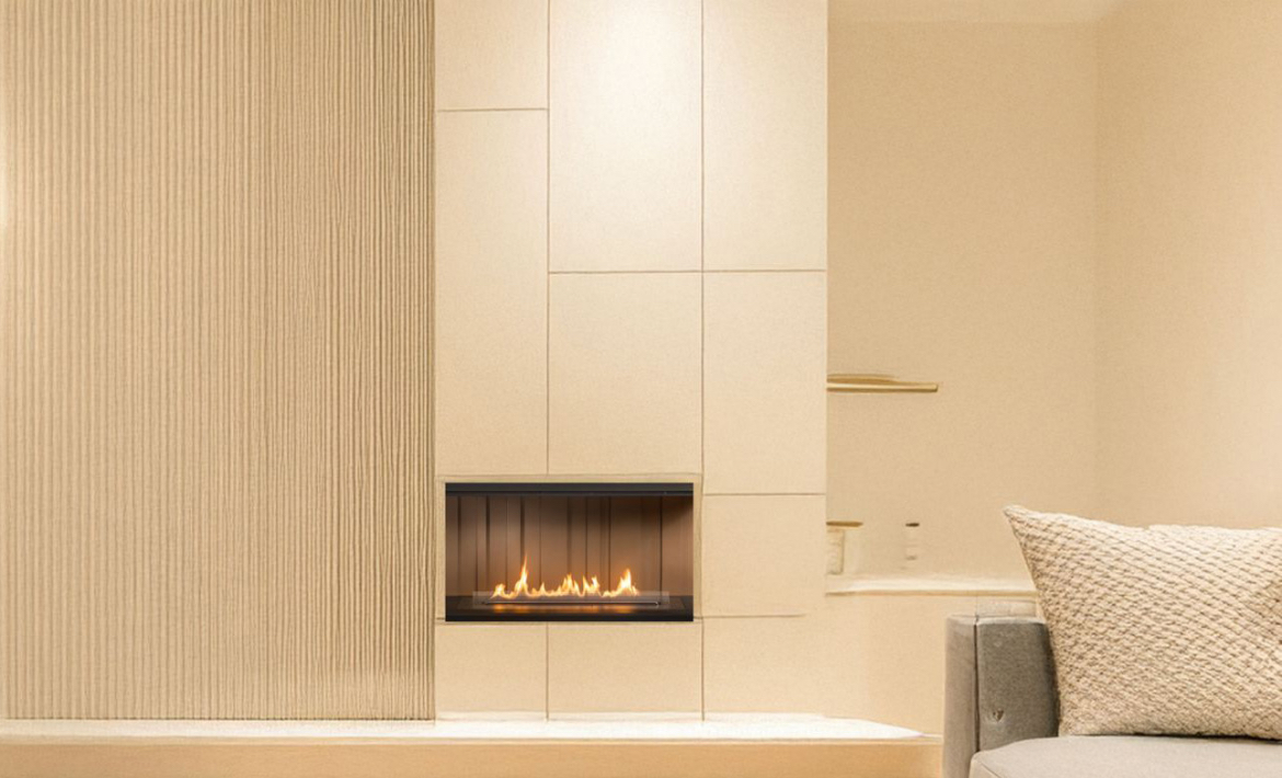 Il rivestimento del caminetto è altamente personalizzabile con cinque finiture esclusive: Round, Plain, Design, Triangle e Original. Oltre al Mocha Mousse, sono disponibili anche le tonalità Nero e Terracotta, per adattarsi a ogni stile e gusto di arredo.