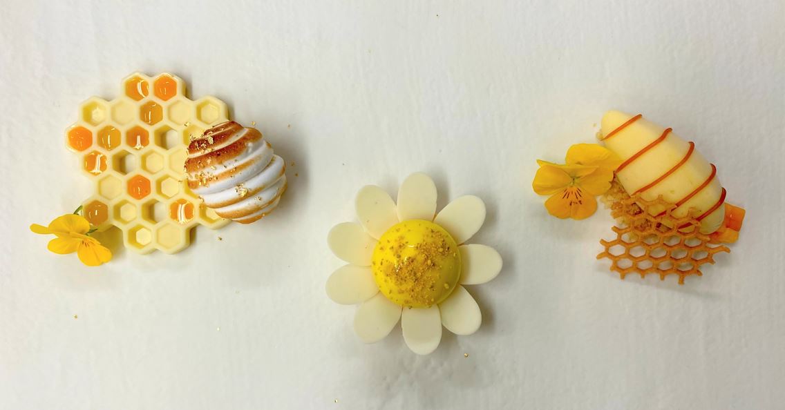 Il nido è un cremoso al miele con frutto della passione, mango e miele. La margherita è un cestino di frolla con bottone di cioccolato bianco ripieno di ananas e delicatissimi petali di cioccolato bianco. Il piccolo favo è composto da due gusci di meringa brunita ripieni di dadolatina di mango. Per rinfrescare una quenelle di sorbetto ananas e mango con caramello salato.
