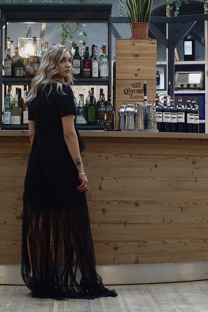 Tra i vari abiti realizzati dalla Casa della Divisa viene presentato anche un tailleur bianco con rifiniture in raso che per l’occasione viene presentato con una mantella in tulle per dare un tocco in più di spettacolo dando l’impressione che sia una sposa a servirti al tavolo. Anche il tubino nero si trasforma, nell’evoluzione della figura del cameriere: ad accogliere i clienti alla reception del ristorante arriva una “divina vampira”, con un abito dal mood rinnovato da tante striscioline di chiffon effetto plissé. Ritorna il denim rivisto e corretto, così come i teschi nelle tonalità di Andy Warhol. Inoltre, il mimetico diventa più femminile, con un tocco di rosa. Leitmotiv della collezione è l’idea che nulla è ciò che sembra: i top sono in realtà realizzati da bandane così come alcuni dettagli dei tubini.