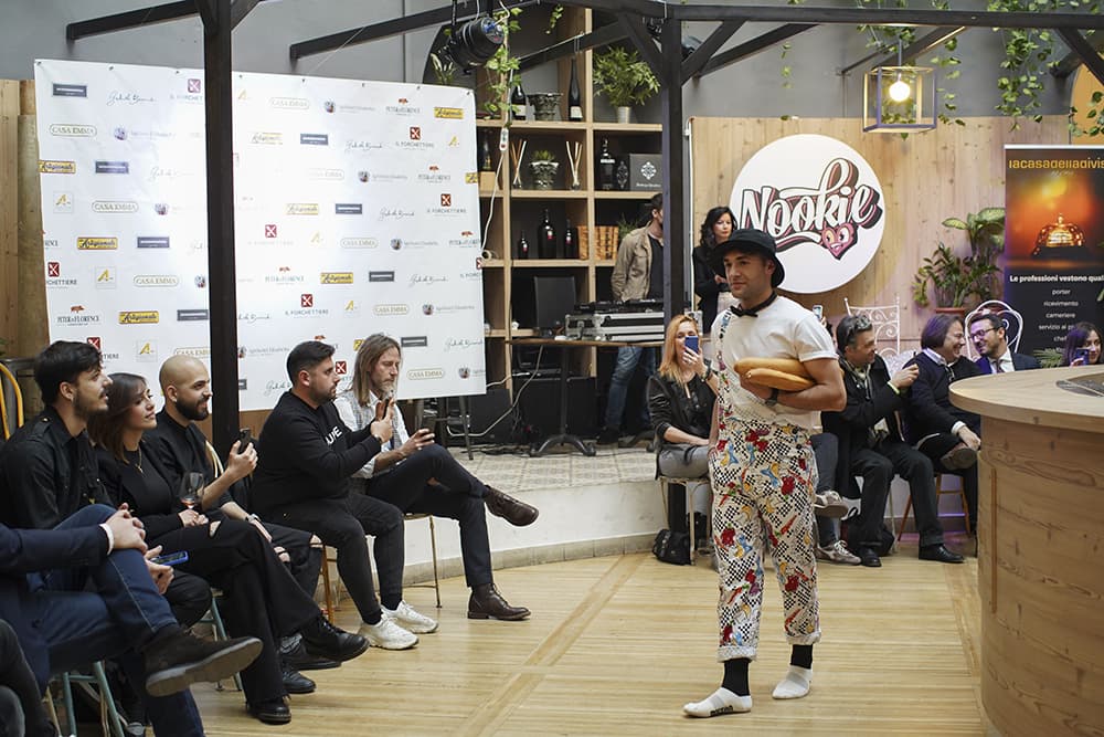 L’appuntamento si è tenuto al cocktail bar “Dome”, a pianta circolare, che per l’occasione si è trasformato in una passerella dove hanno sfilato 24 capi tratti dalla collezione realizzata da La Casa della Divisa per il cameriere-influencer Gabriele Bianchi, recentemente inserito da Forbes tra i 5 nomi under 30 più influenti in Italia nel settore del food. A calcare la scena sono stati i veri addetti ai lavori, dodici camerieri (sei uomini e sei donne) ognuno dei quali ha indossato due capi.