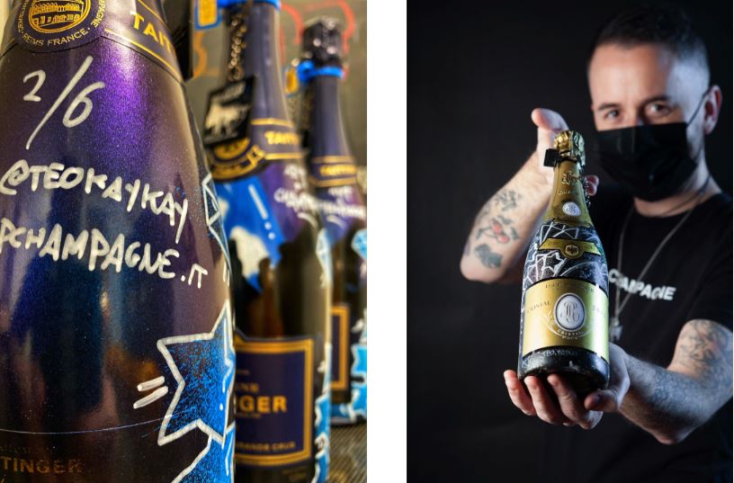 Teo KayKay è stato il primo Street Artist ad associare la propria arte allo Champagne, con le sue opere sempre in edizione super limitata (molti sono pezzi unici). Andrea Silvello, aka TopChampagne, ha sviluppato quella che oggi è la principale piattaforma per gli amanti dello Champagne in Italia su Instagram.