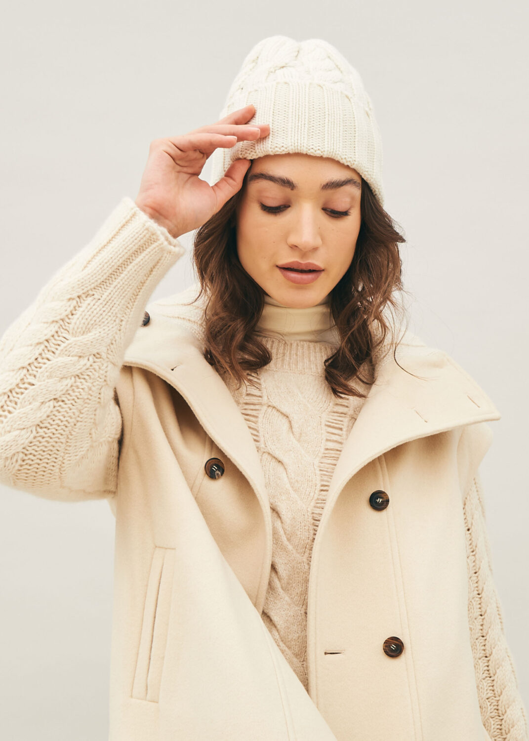 Infine, il cappello bianco in cashmere lavorato a trecce, morbido e resistente, ideale per le giornate più fredde.