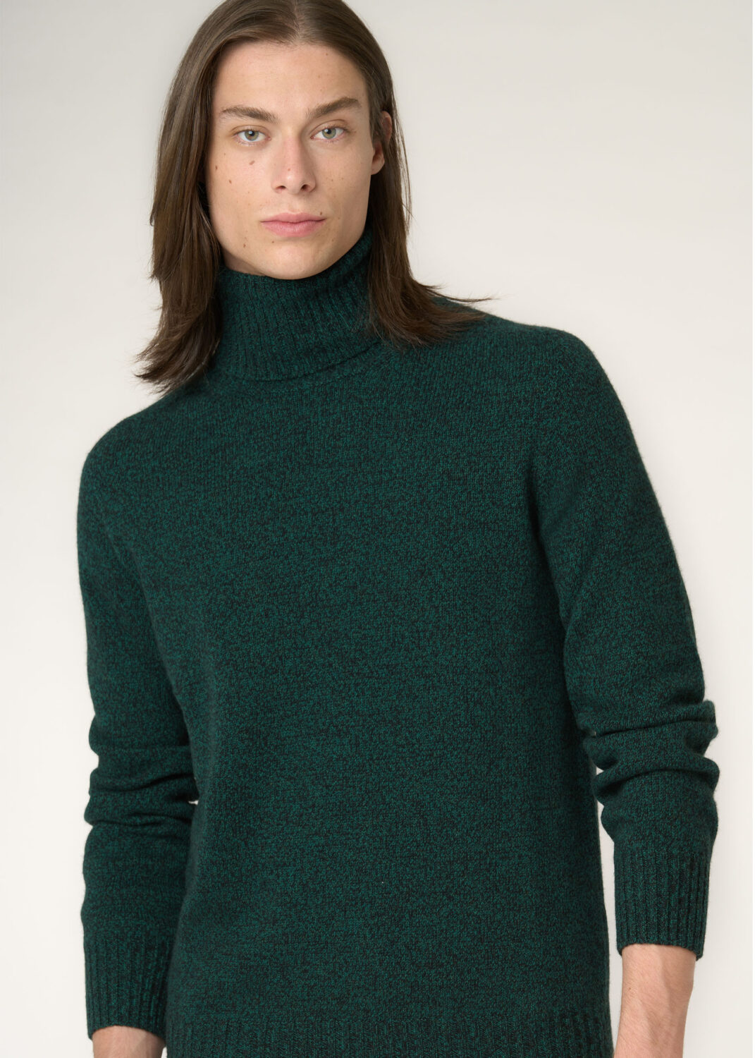 La maglia collo alto rasata in cashmere mouliné verde, caratterizzata dalla tecnica iconica del brand, dove due fili di cashmere di colore diverso sono mulinati insieme, creando un suggestivo effetto bicolore.