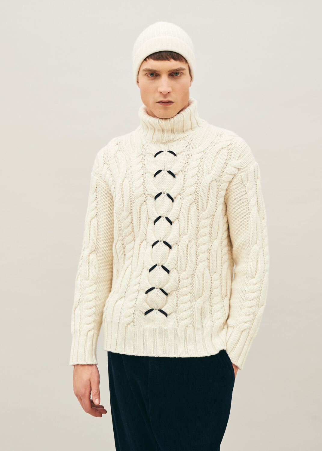 La maglia collo alto in cashmere bianco arricchita da lavorazioni a trecce dallo stile nordico, con impunture a contrasto centrali. Un’elegante interpretazione dell’artigianato nordico.
