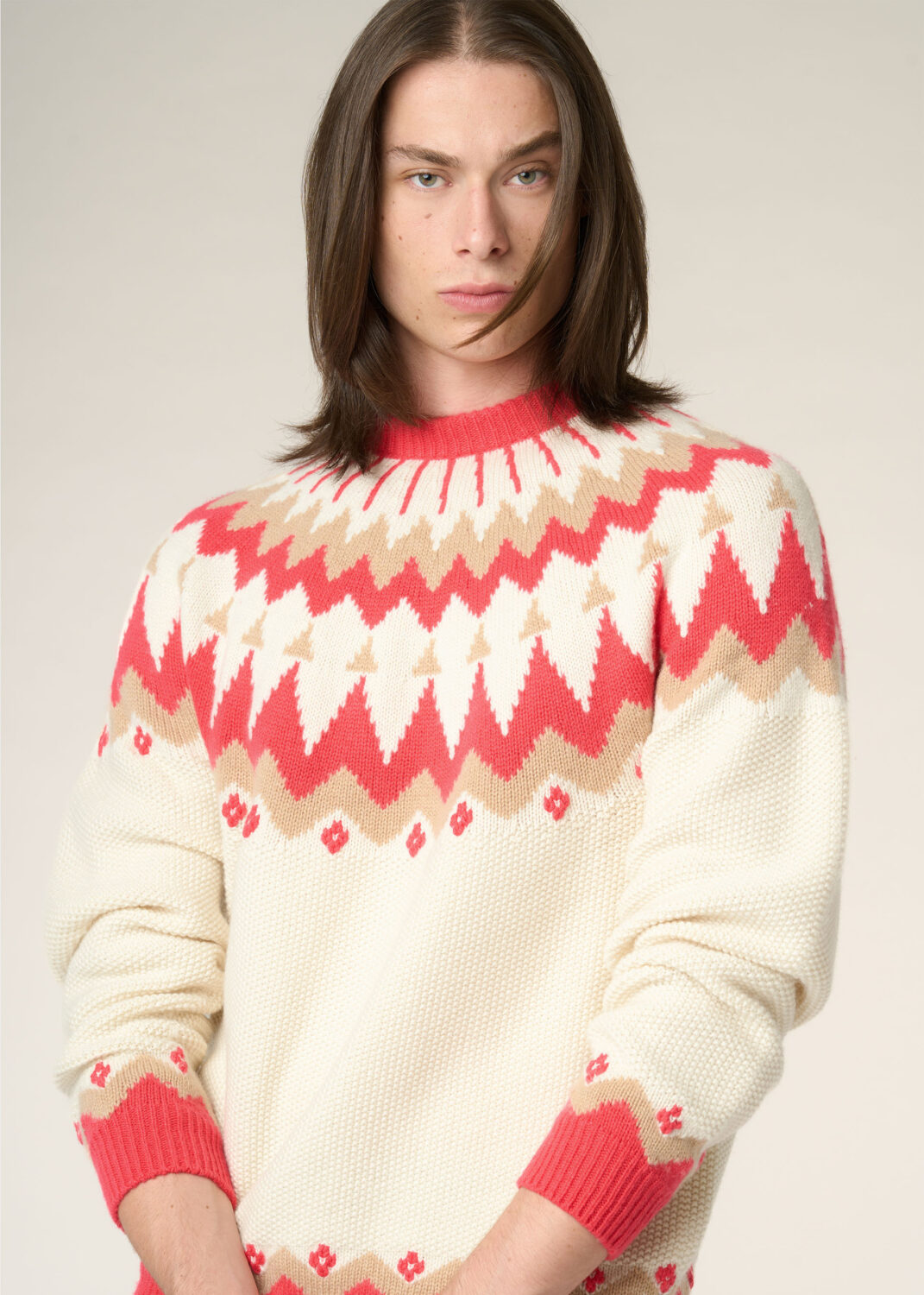 Malo offre anche un’opzione unisex, ovvero una maglia girocollo in cashmere, impreziosita da ricami a mano e arricchita dalla lavorazione jaquard alle estremità, si ispira allo stile nordico. Realizzata con il punto grana di riso, il jaquard è eseguito utilizzando telai integrali, permettendo la creazione di capi preziosi senza cuciture. Disponibile in due versioni di colore: bianco e rosso azalea oppure bianco e marrone.